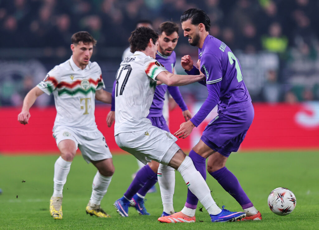 BUDAPEST, HUNGARY – MARCH 12: Florian Grillitsch of SC Braga battles for possession with Callum O’Dowda of Ferencvarosi TC during the UEFA Europa League 2025/26 Round of 16 First Leg match between Ferencvarosi TC and SC Braga at Ferencvaros Stadion on March 12, 2026 in Budapest, Hungary. (Photo by David Balogh – UEFA/UEFA via Getty Images)