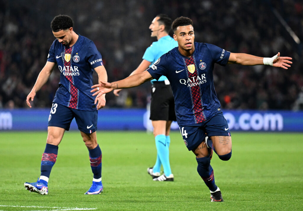 PARIS, FRANCE – APRIL 08: Desire Doue of Paris Saint-Germain celebrates scoring his team’s first goal during the UEFA Champions League 2025/26 Quarter-Final First Leg match between Paris Saint-Germain FC and Liverpool FC at Parc des Princes on April 08, 2026 in Paris, France. (Photo by Stuart Franklin – UEFA/UEFA via Getty Images)